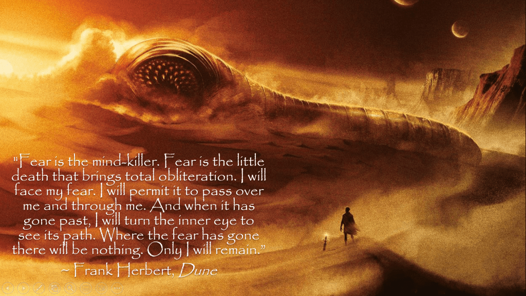 What do I use my might and strength for? Does it serve only myself or does it extend to others? This returns us to our soul yearning, our “Big Deal,” our “Grand Endeavor.” What am I willing to fight for, to work for? Without courage, fear takes over in our lives. My favorite quote on fear comes from Frank Herbert’s (1920-1986) epic novel Dune: “Fear is the mind-killer. Fear is the little-death that brings total obliteration. I will face my fear. I will permit it to pass over me and through me. And when it has gone past I will turn the inner eye to see its path. Where the fear has gone there will be nothing. Only I will remain.”