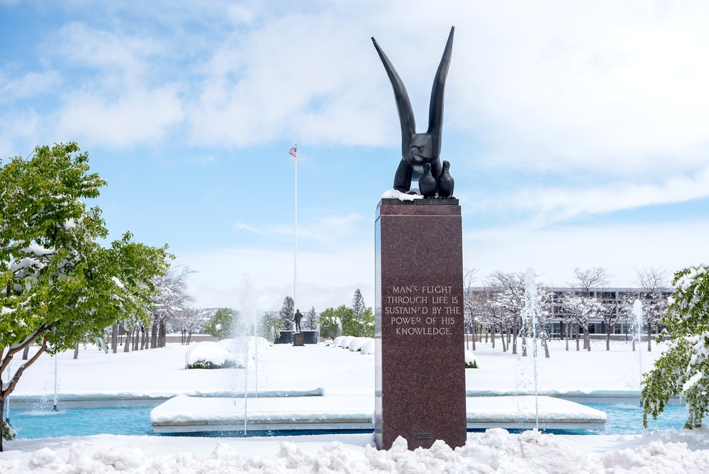 I’ve mentioned in previous episodes that I’ve taught at the U.S. Air Force Academy for 15 years now. The heart of the Cadet Area is the Terrazzo, which was designed by landscape architect Dan Kiley. The name comes from the walkway’s terrazzo tiles that are set among a checkerboard of geometric marble strips forming a square around the grassy knoll known as “Spirit Hill,” with a historic plane standing as a sentinel in each corner. On the east side of the Terrazzo lies the Air Gardens, boasting two reflecting pools and fountains. On the south side of the Air Gardens is the famous Eagle and Fledgling Statue. I passed by it just this morning. The inscription by Lt. Col. Austin “Dusty” Miller, USAF (1914-2006) reads: “Man’s flight through life is sustained by the power of his knowledge.” Each of us, man or woman, is sustained by the power of our knowledge – and more specifically by the knowledge we master and learn to apply in our flight through life.