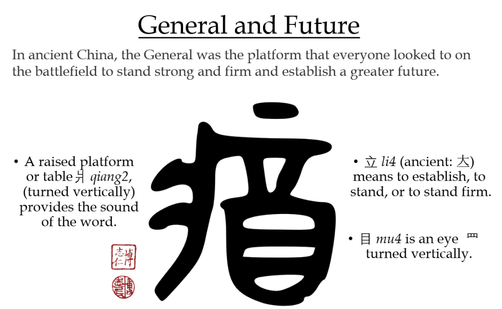 The fourth butt-kicking battlefield beatitude to embrace to start winning our battles is the be the general of our futures! The Chinese character for general is jiang1 將 (simplified: 将). Interestingly, it is also the character for “future.” Its current etymology is a bit muddled as it depicts a simplified version of ribs or meat ⺼ (full: 肉) above a hand and thumb 寸, which doesn’t give any insights into the word. However, the ancient character form as recorded on Zhou Dynasty bronze inscriptions from 3,000 years ago is clearer, comprised of a platform爿 (qiang2, which also serves as the phonetic) beside the character to “establish,” to “stand,” or to “stand firm” or “stand strong” 立 (li4; ancient form: 𡗓), which is itself comprised of the word for great or large 大 (da4) standing strong firm or large on the ground, above a sideways eye 目 (mu4). Taken together, the etymology reveals that in ancient China, the general was the platform that everyone looked to on the battlefield to stand firm and establish a stronger “future.” This also helps explain the meaning of “future” associated with this word as in the modern Chinese term for “future” 将来 jiang1lai2, which literally means: “when the general arrives.” At some future point in time, when the general arrives on the battlefield everything will get sorted out, become firmly established, and there will be a greater, better future.