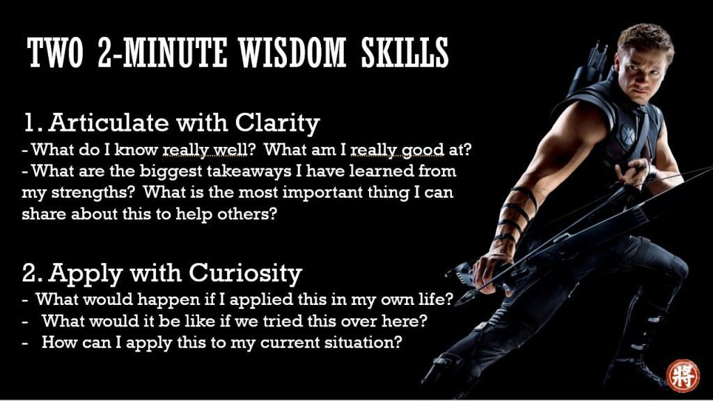 So today we’ve talked about five 2-minute exercises that you can do to level up your life to level up our leadership. Even if it’s just being a leader of ourselves, we talked about wisdom — the arrow of applied knowledge and I gave you the two, 2-minute wisdom skills to articulate what we know, so that it can help other people, and to apply what other people know in our own lives and our own situations and our own circumstances.