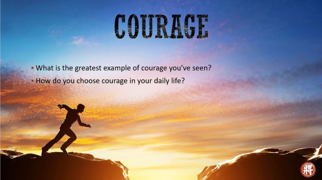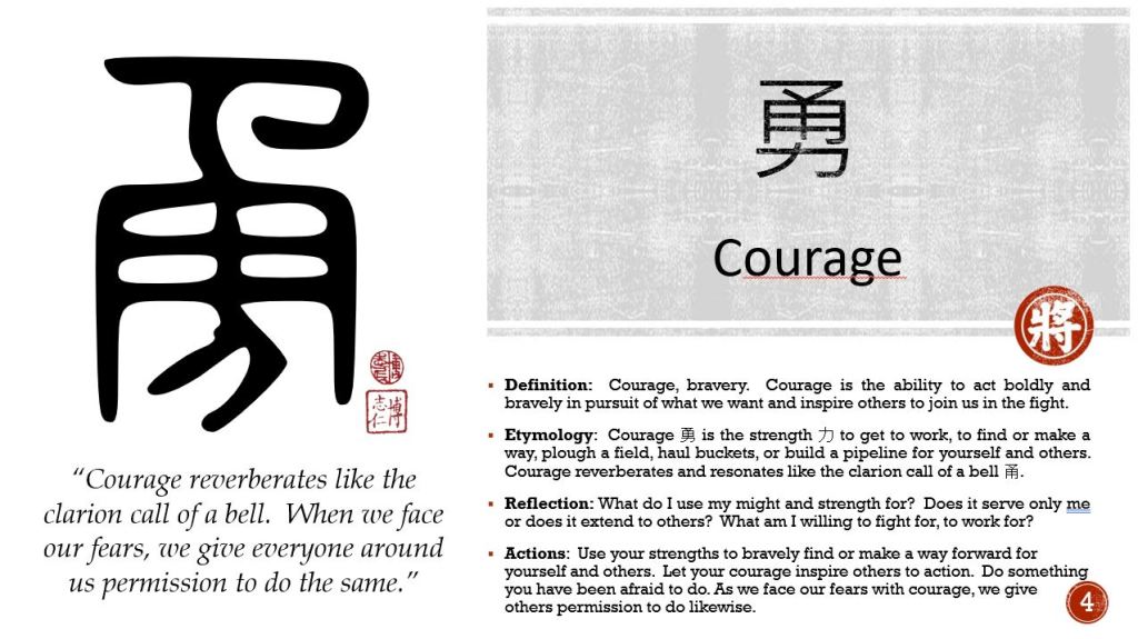 Courage is definitely one of my favorite attributes out of five because the etymology of courage in Chinese is so visually compelling, it depicts a bell above strength, and it conveys this sense that courage is a Clarion call. Courage reverberates like a bell when you hear that bell, when you hear that bell from wherever you are, and you know it’s a long ways away and it’s just carried. It stirs something inside of us.