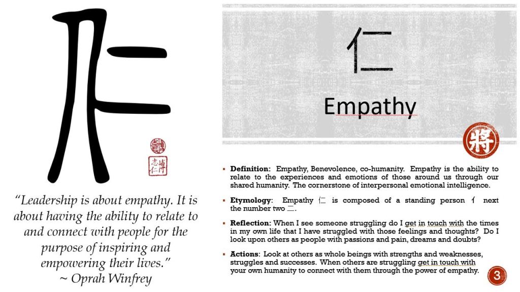 In the Chinese tradition, this is usually translated as benevolence or humaneness, or co-humanity. What we’re really talking about here is empathy. We’re talking about the ways that we interact with another human being with all those people around us. That is the very etymology of the word.