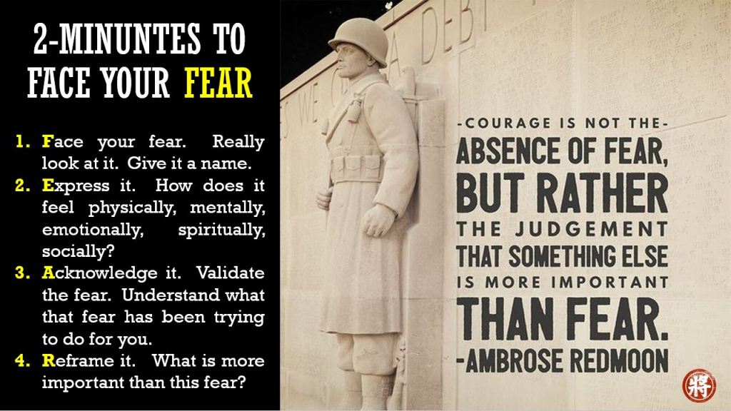 We talked about empathy. Getting in touch with our own humanity and that SHARE skills exercise: Share, Hear, Ask, Relate, and Express. We talked about courage — the clarion call to face our fears and I gave you the “Face your FEAR” exercise: Face it, Express it, Acknowledge it, and Reframe it.