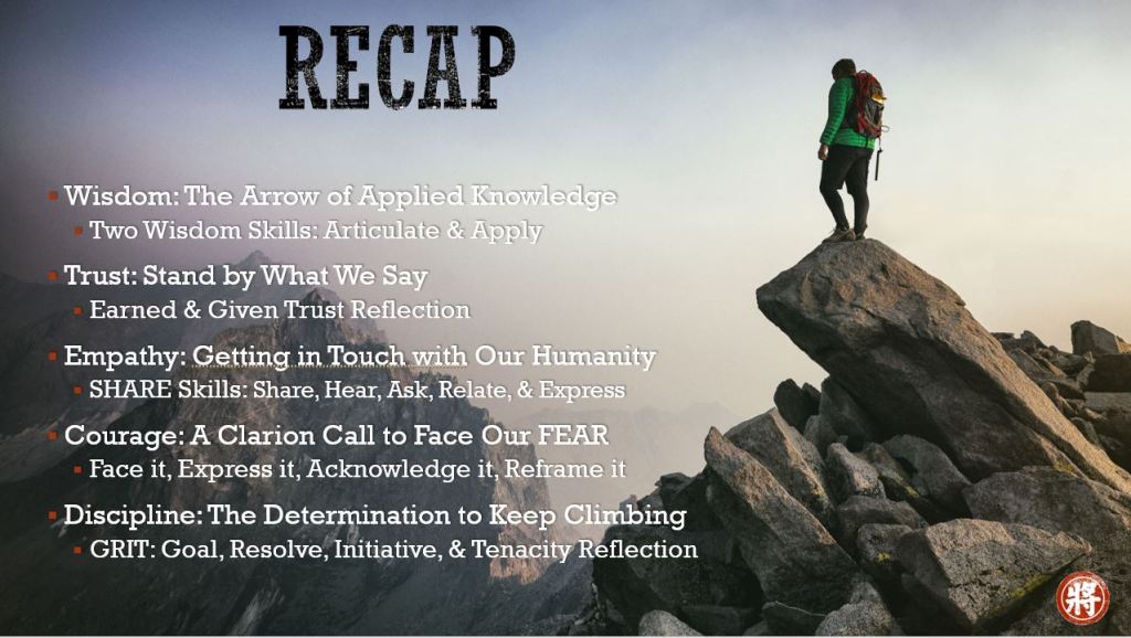 In Episode 23 of “Warrior: The Art of War for Life ~ A Podcast on Winning,” I go unscripted to reflect on the “Five Essential Leadership Attributes” first introduced in Episode 3 and discussed in great detail in Episode 4. They are: wisdom, trust, empathy, courage, and disciplined determination, or grit. In the months, since I first introduced them, I have developed some quick and accessible tools and exercises to help us “level” them up in our lives in about two minutes!